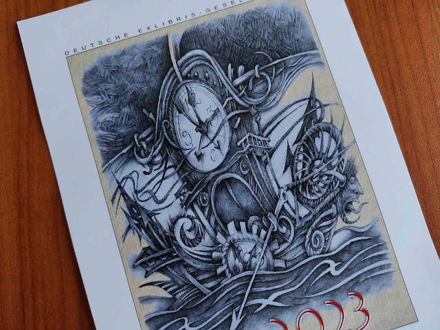 Das DEG-PF 2023 (CGD/CAD) zeigt ein Boot, das auf dem Wasser treibt. Erkennbar der Schiffsrumpf und eine Reihe von eng miteinander verbundenen Fantasie-Aufbauten: vor oder Turmuhr, deren Stunden- und Minutenzeiger auf 5 vor 12 stehen, davor eine in die Wogen eintauchende Zahnraduhr, am Bug der Kopf einer Galionsfigur mit weit geöffnetem Mund (mit züngelnder Zunge, oder züngeln- dem Fortsatz der links neben dem Kopf platzierten Kringelform?), darüber ein die Kringelform aufgreifendes Steuerrad, das Boot begrenzende Zeiger und Pfeile, überall Schlangenlinien, auch als Stand- oder Turmuhrhaube und als Meereswellen, über allem der Himmel als Flechtwerk. Es handelt sich unverkennbar um eine Arbeit des ukrainischen Künstlers Sergiy Hrapov (* 1956).